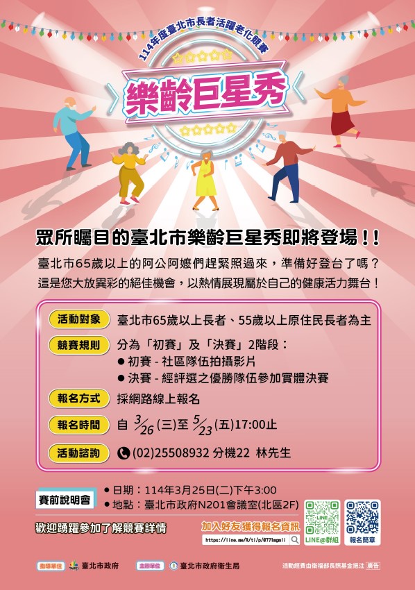 (三)為利社區長者團體瞭解競賽規則及報名方式,訂於114年3月25日(星期二)下午3時採實體、線上併行方式辦理說明會(會議地點詳附件海報電子檔),由隊伍自由報名參加。
