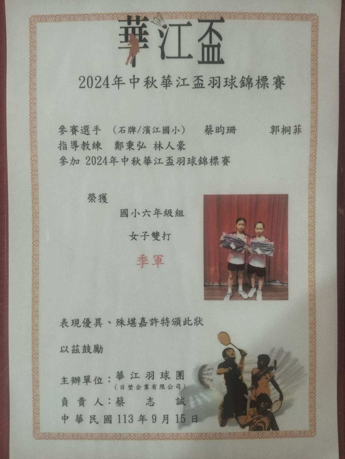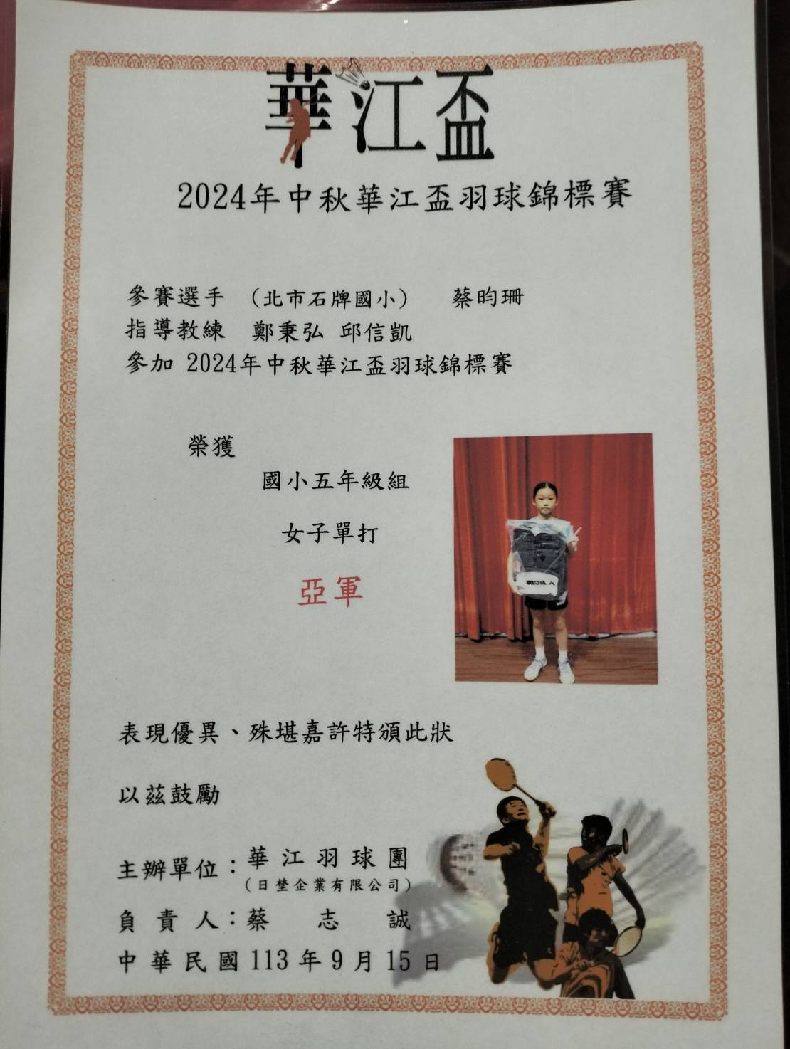 恭喜蔡昀珊、恭喜石牌國小羽球隊