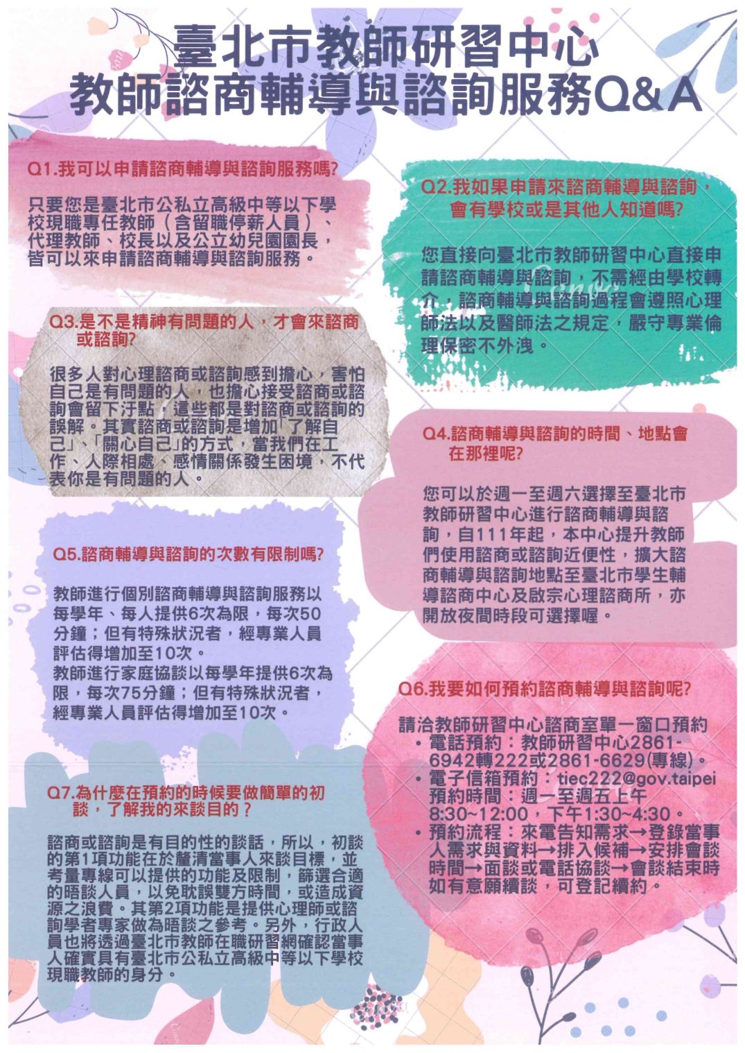 相關資訊可參考臺北市教師研習中心網站>教師諮商輔導支持服務(連結:https://tiec.gov.taipei/Content_List.aspx?n=2037F8AD136012CB)