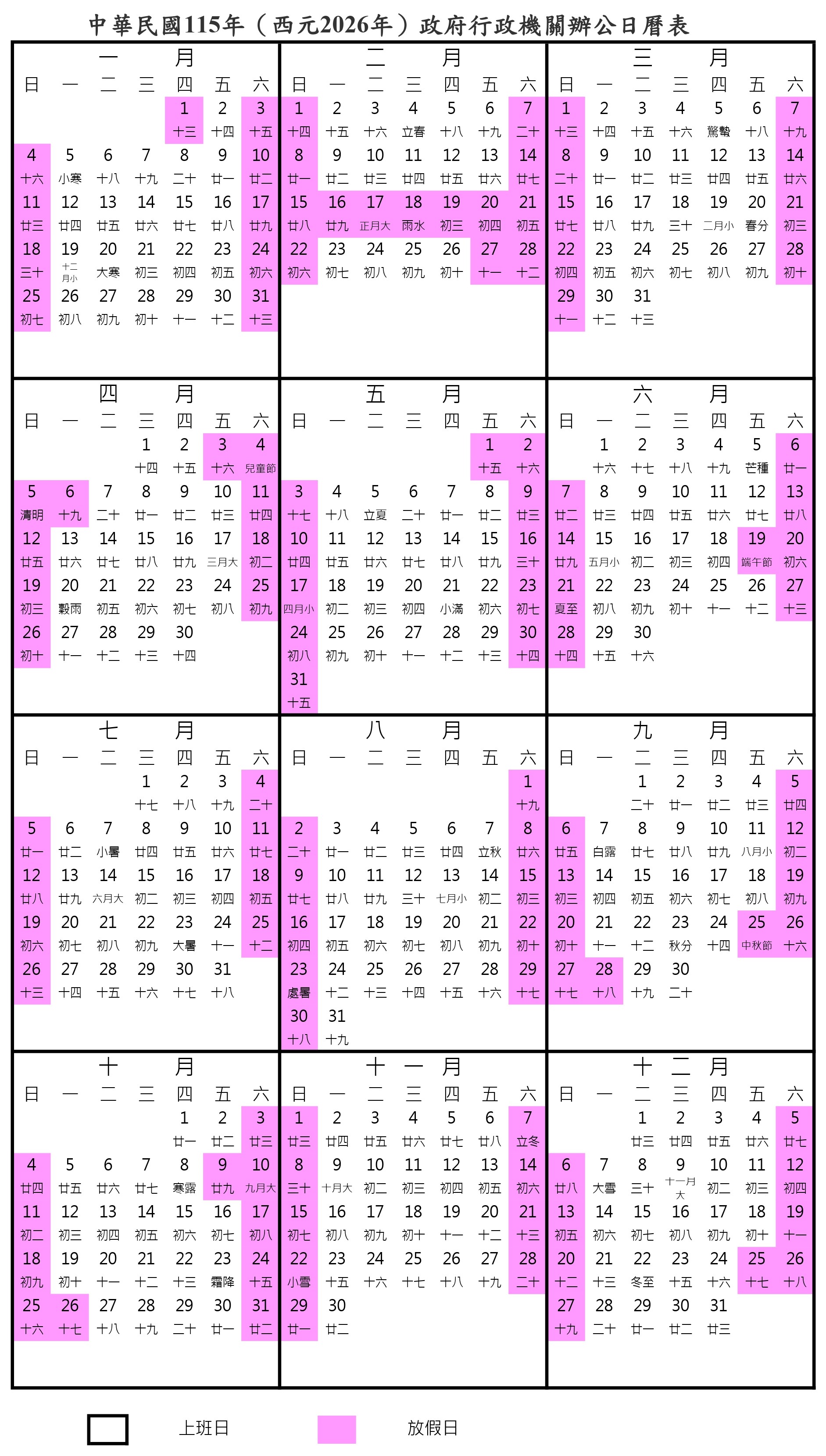 一、連續9日假期:除夕及春節(2月14日至2月22日),除夕前一日(2月15日,星期日)於初四(2月20日,星期五)補假。