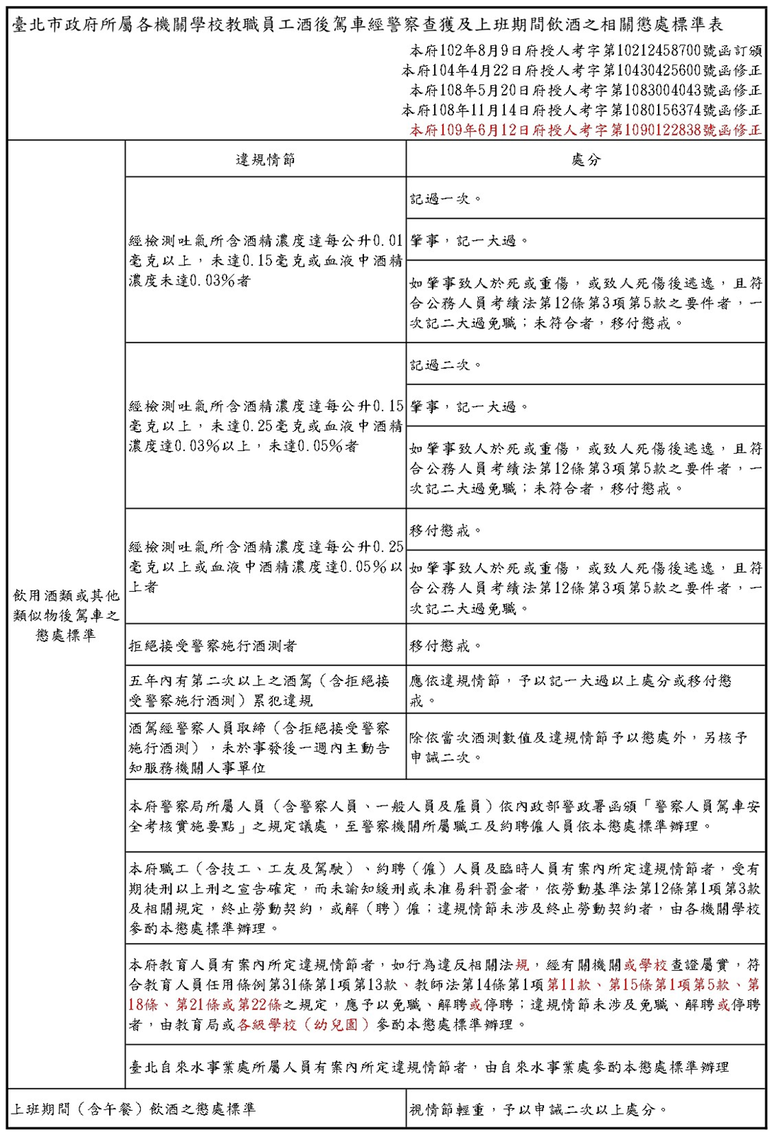 三、檢附「臺北市政府所屬各機關學校教職員工酒後駕車經警察查獲及上班期間飲酒之相關懲處標準表」供參。