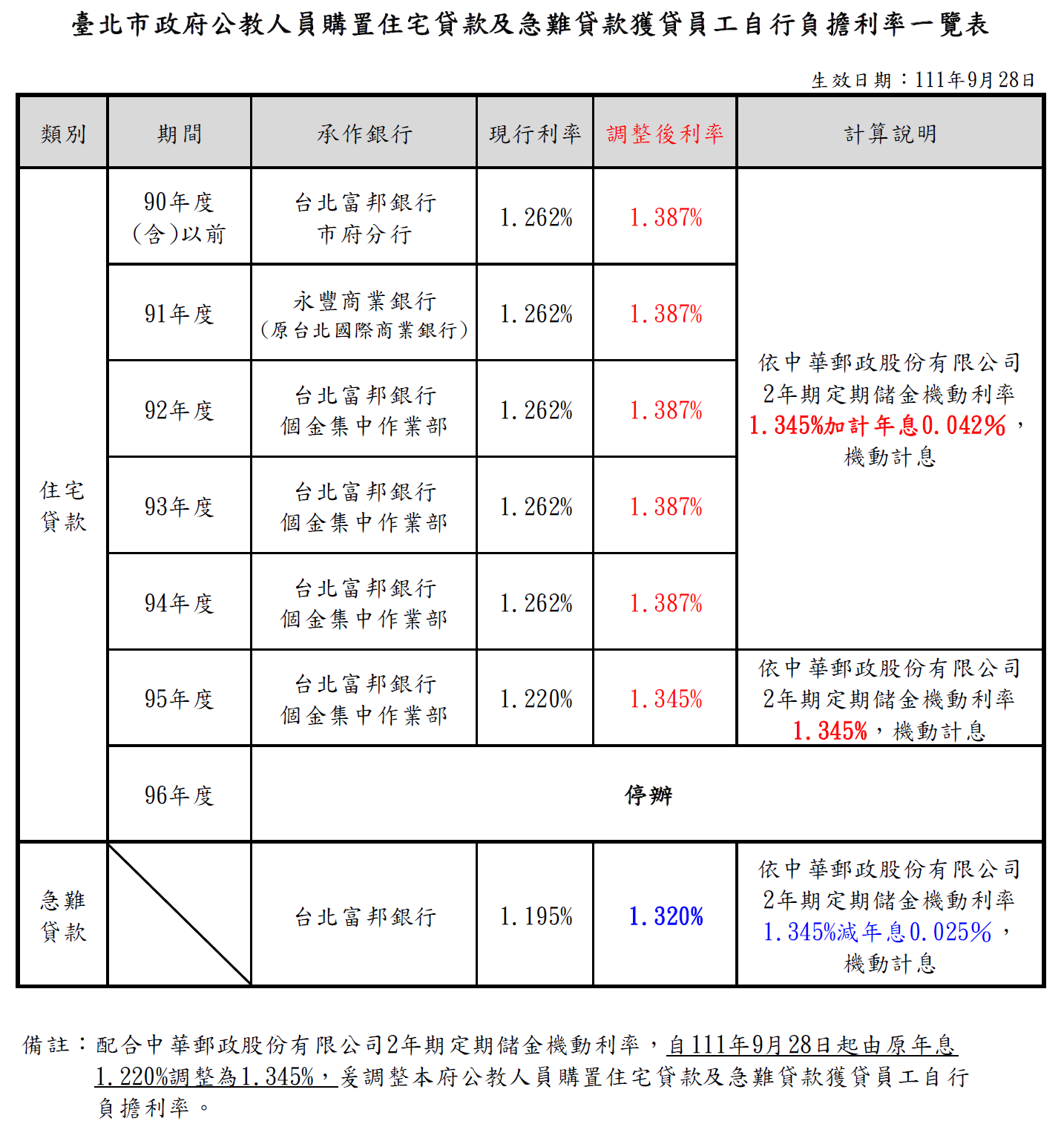 一、中華郵政股份有限公司2年期定期儲金機動利率(以下簡稱中華郵政2年定儲利率)自111年9月28日起由原1.220%調整為1.345%,爰配合調整旨揭獲貸員工自行負擔利率如下: