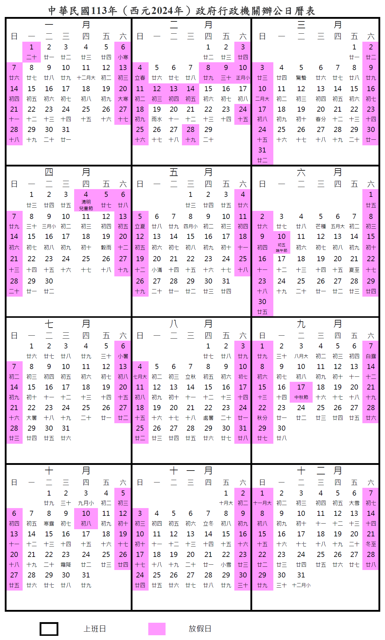 二、113年全年366日,總放假日數115日,連續假期(含例假日)包括開國紀念日(3日)、農曆春節假期(7日)、兒童節及民族掃墓節(4日)及端午節(3日),其中紀念日及節日之補假、調整放假及補行上班情形如下: