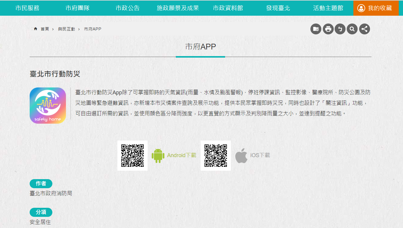 一、臺北市行動防災App已完成更版上架作業,本次改版採用極 簡風格搭配明亮乾淨的配色,及直覺化、友善化、視覺 化、客製化及生活化的設計原則,並導入英文介面選項, 提升使用者體驗。