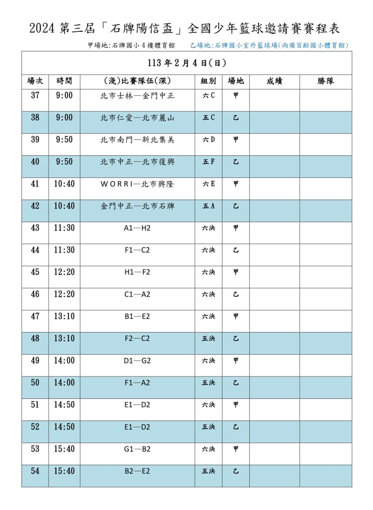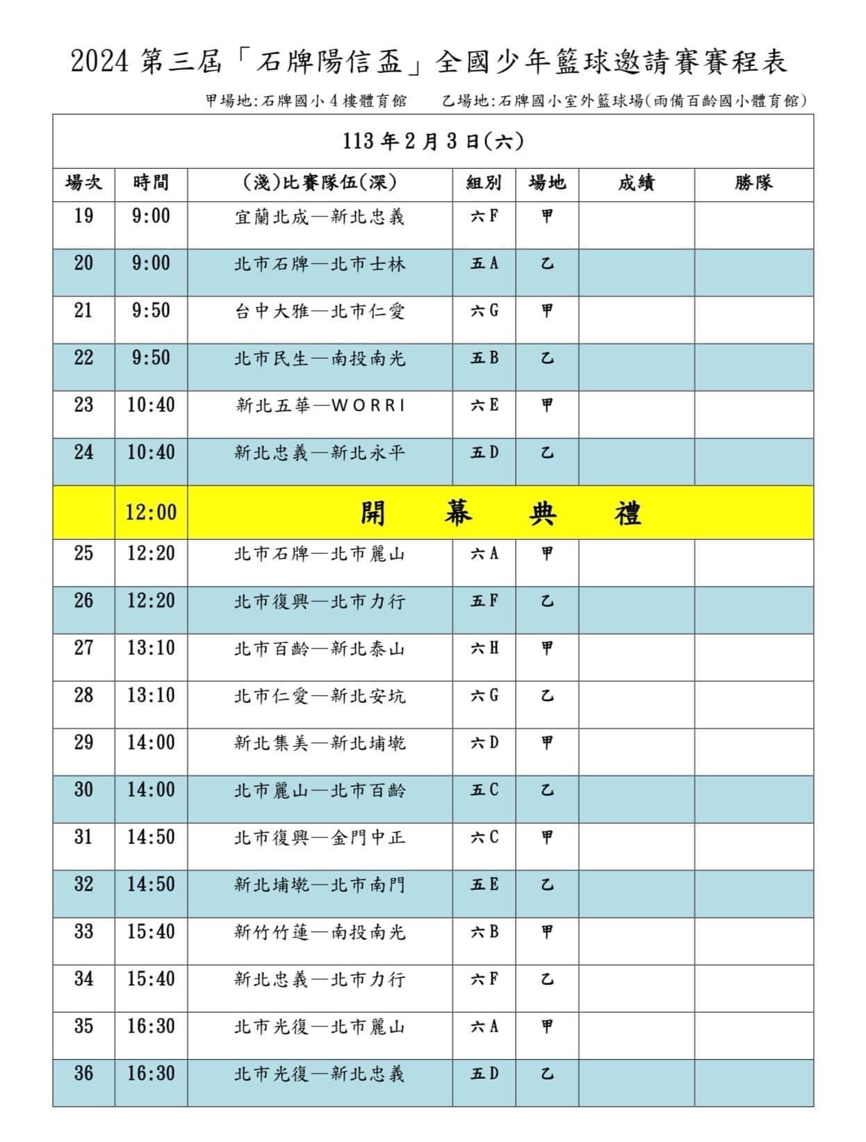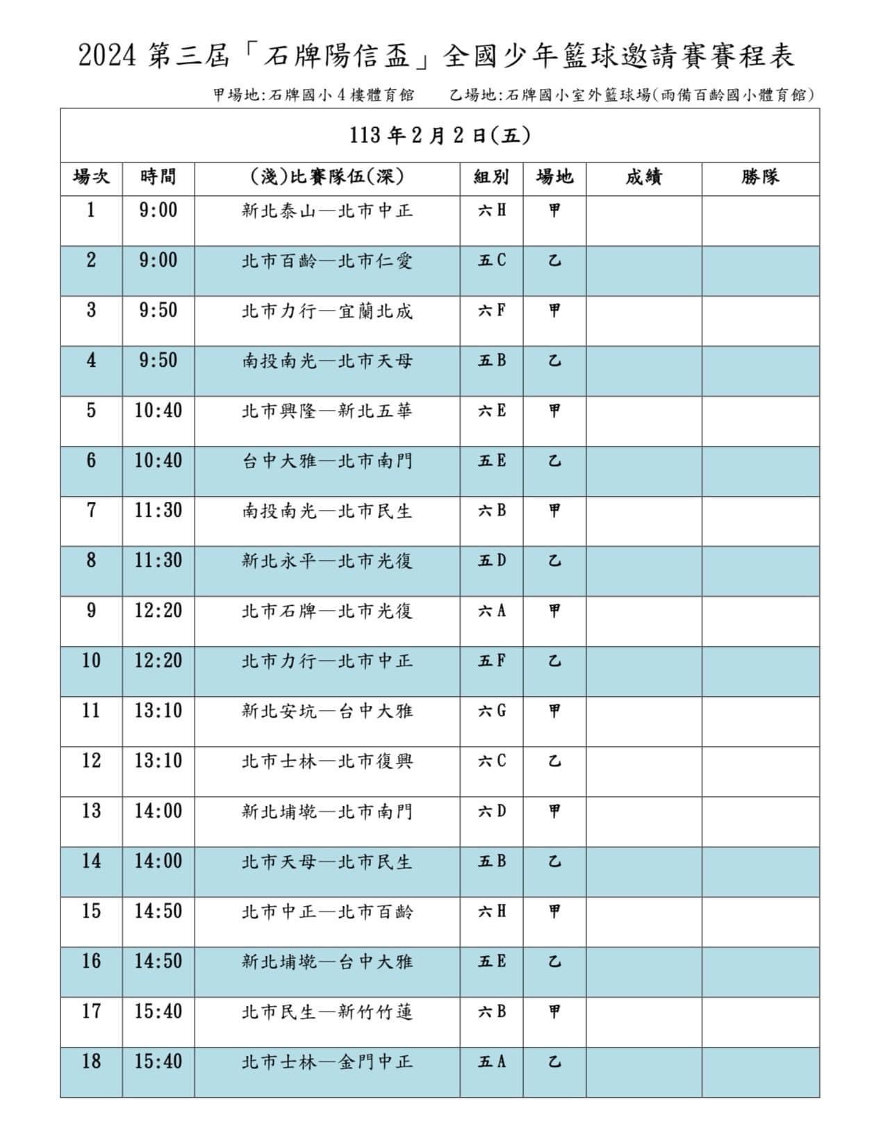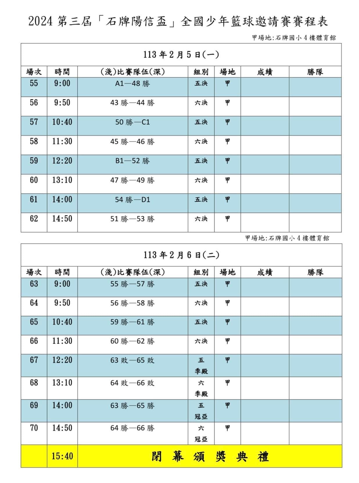 歡迎老師、家長及小朋友們,在2/2~2/6到現場觀看精彩可期的籃球賽事;如果時間有限,也可鎖定石小籃球小將們的賽程時間,帶著石小籃球隊必勝的心情,一同到場搖旗吶喊,為石牌小將們加油打氣吧!