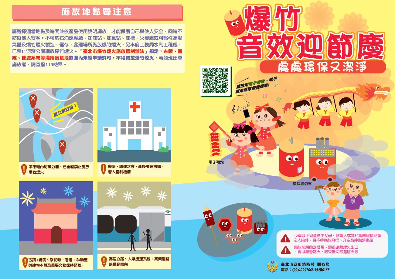 (二)購買爆竹煙火應選購合格的產品,並了解產品種類屬性 後,依使用說明進行燃放;建議以爆竹音效(本府消防局網站下載https://reurl.cc/pr3W0d),取代傳統爆竹煙火施放,可確保環境安全及潔淨。