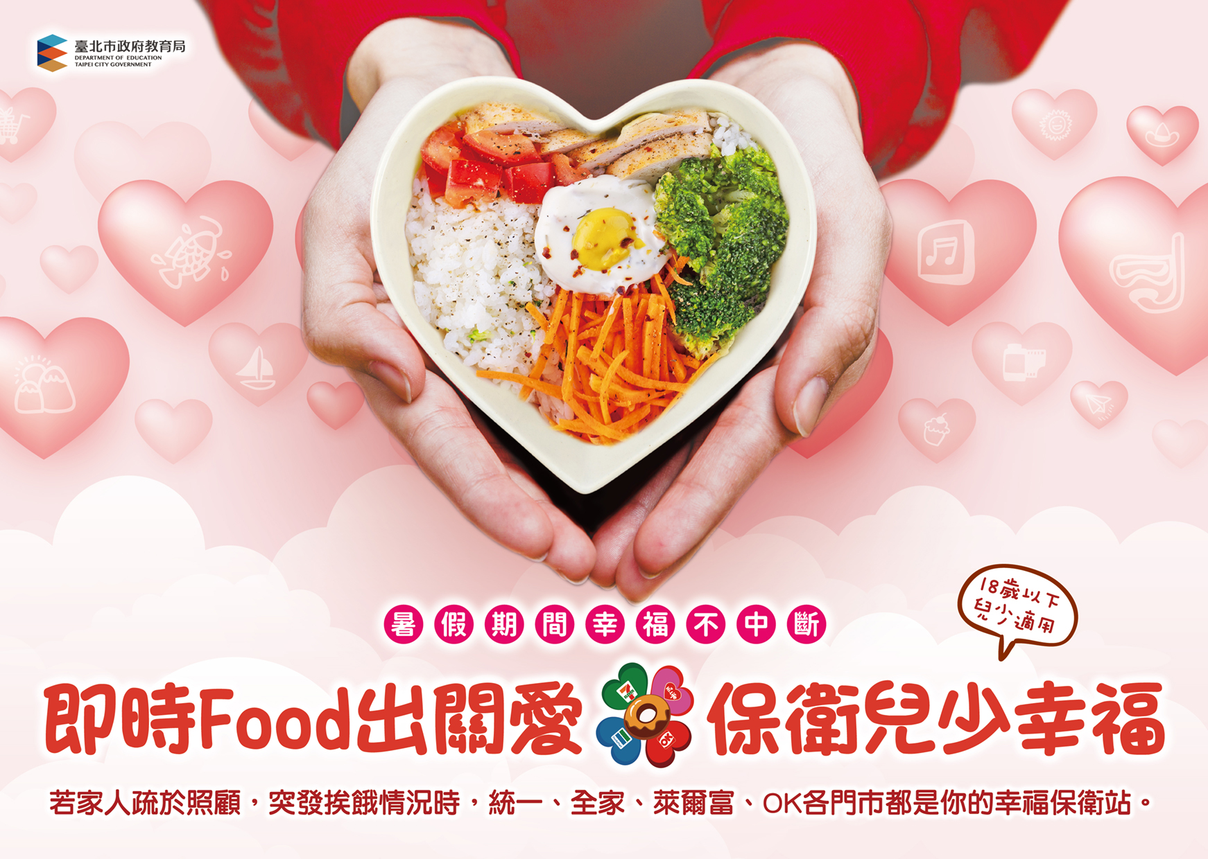 『臺北市幸福保衛站』守護兒少幸福!臺北市18歲 以下兒童或青少年遭遇緊急變故挨餓時,可至統一、全 家、萊爾富、來來(OK)超商求助取餐。