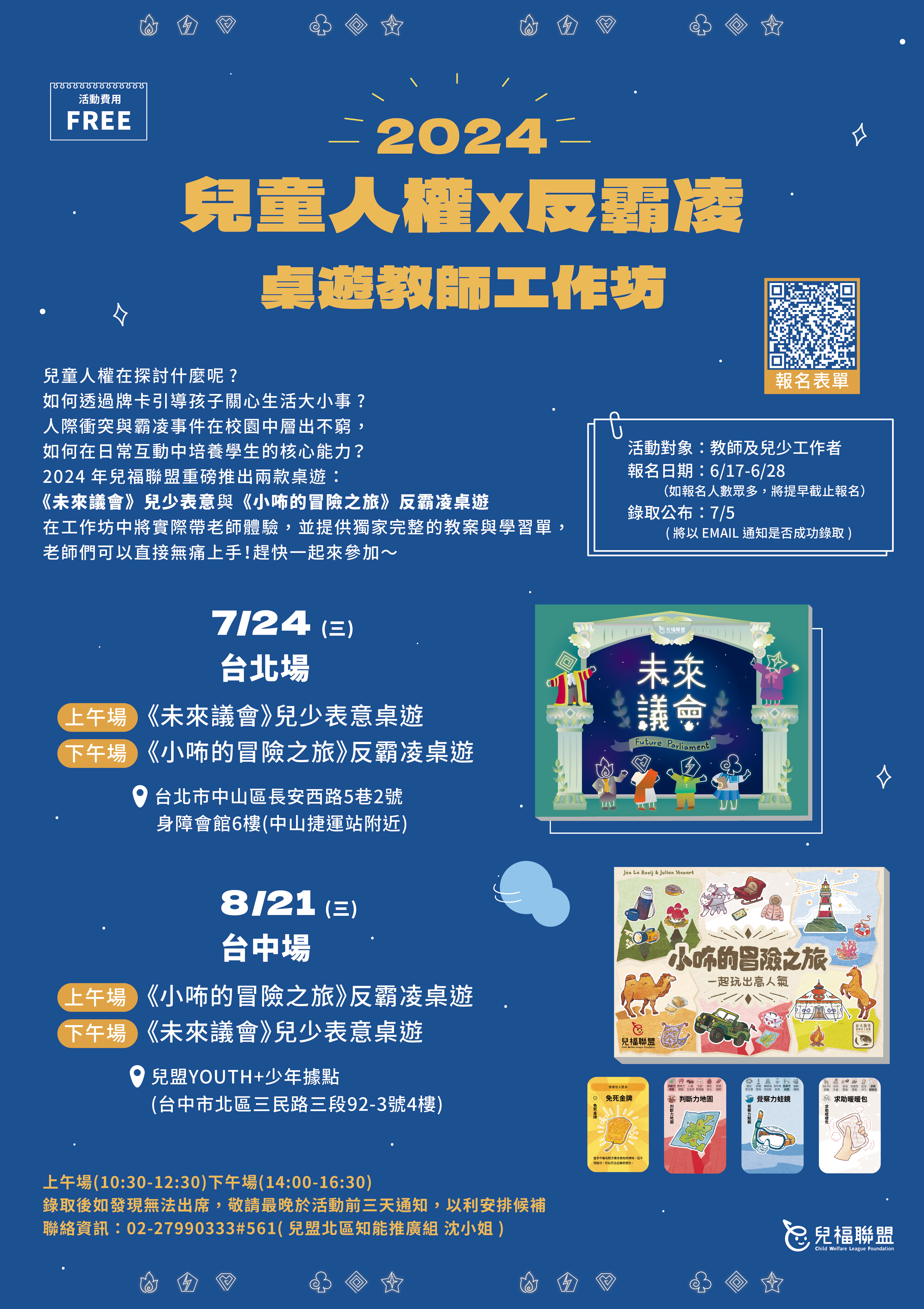 一、兒童人權在探討什麼呢?如何透過牌卡引導孩子關心生活 大小事?人際衝突與霸凌事件在校園中層出不窮,如何在 日常互動中培養學生的核心能力?2024年兒福聯盟重磅推 出兩款桌遊:《未來議會》兒少表意與《小咘的冒險之 旅》反霸凌桌遊,在工作坊中將實際體驗,並提供獨家完 整的教案與學習單,老師們可以直接快速上手!趕快一起 來參加~