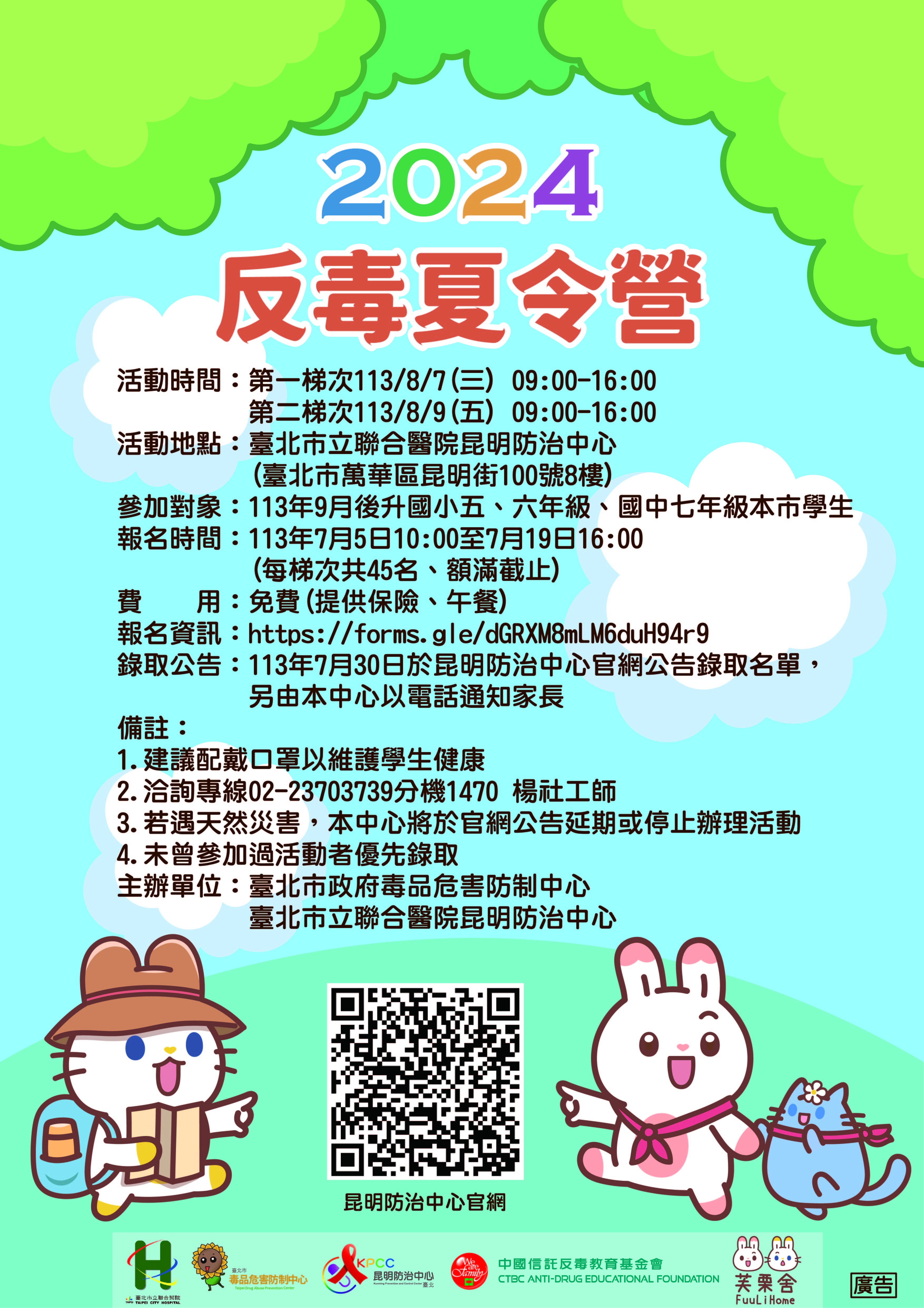八、檢附營隊宣傳海報一份,請協助公告宣傳,報名資訊可至 昆明防治中心官網查詢(https://tpech.gov.taipei /mp109231)。