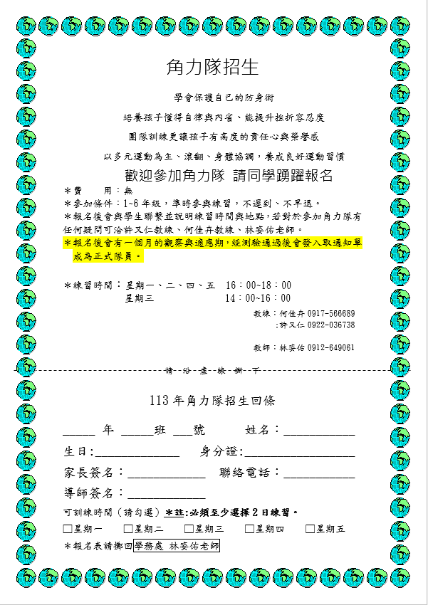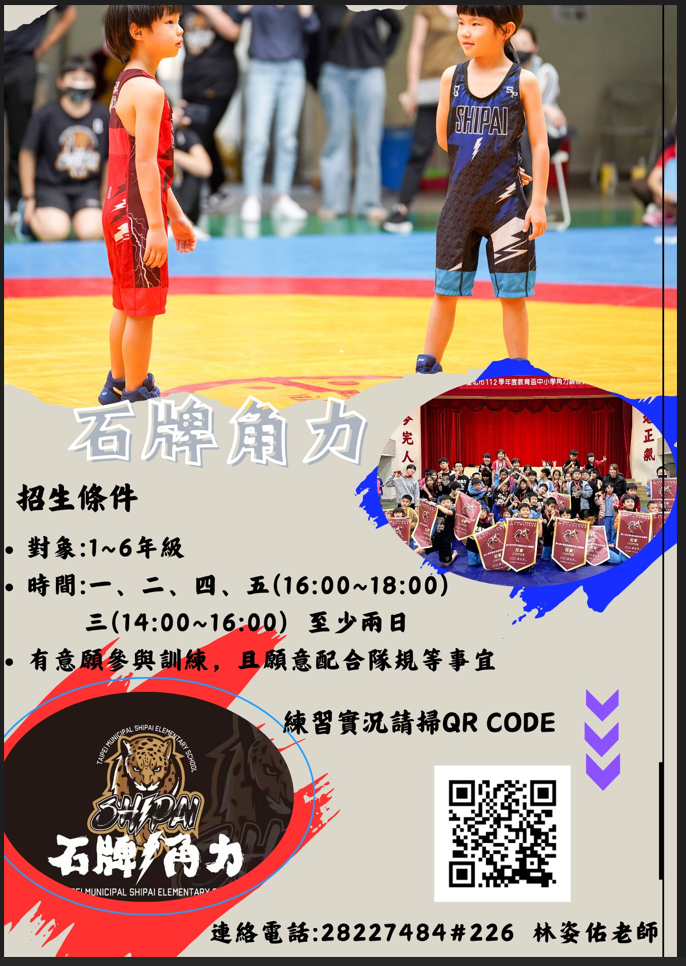 *報名後會與學生聯繫並說明練習時間與地點,若對於參加角力隊有任何疑問可洽許又仁教練、何佳卉教練、林姿佑老師。