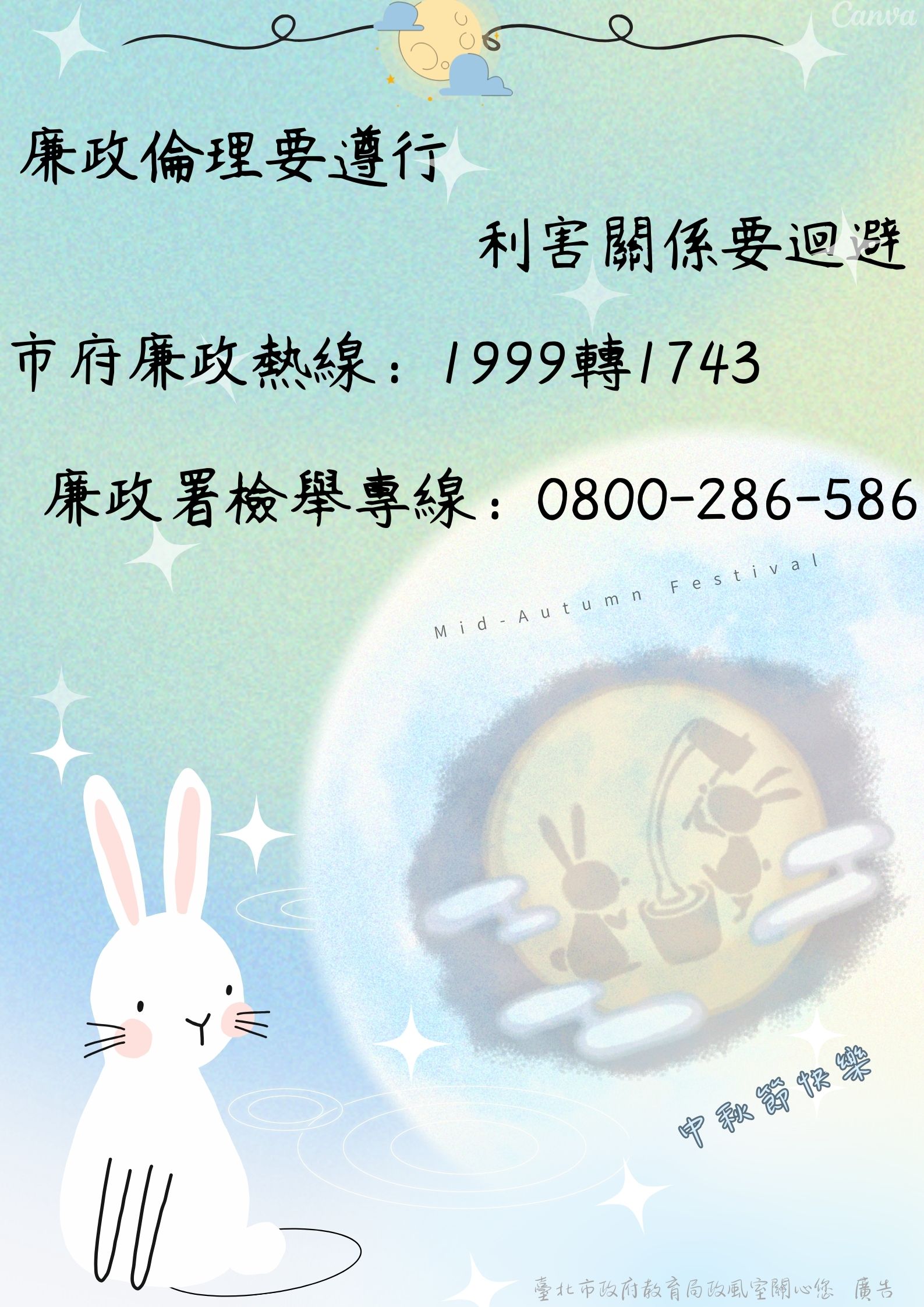 中秋節將屆,餽贈、邀宴行為較為頻繁,請長官同仁恪遵「臺北市政府公務員廉政倫理規範」規定,對與職務有利害關係者之受贈財物、飲宴應酬、請託關說及其他廉政倫理事件,應依規定確實報備登錄,並避免酒駕、出入不正當場所之違法違紀行為。