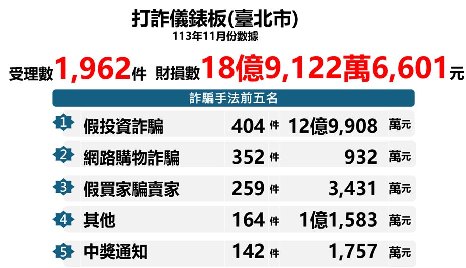 二、分析本市113年11月各類詐欺案件發生數共計1,962件,前3 大詐欺手法及件數如下: