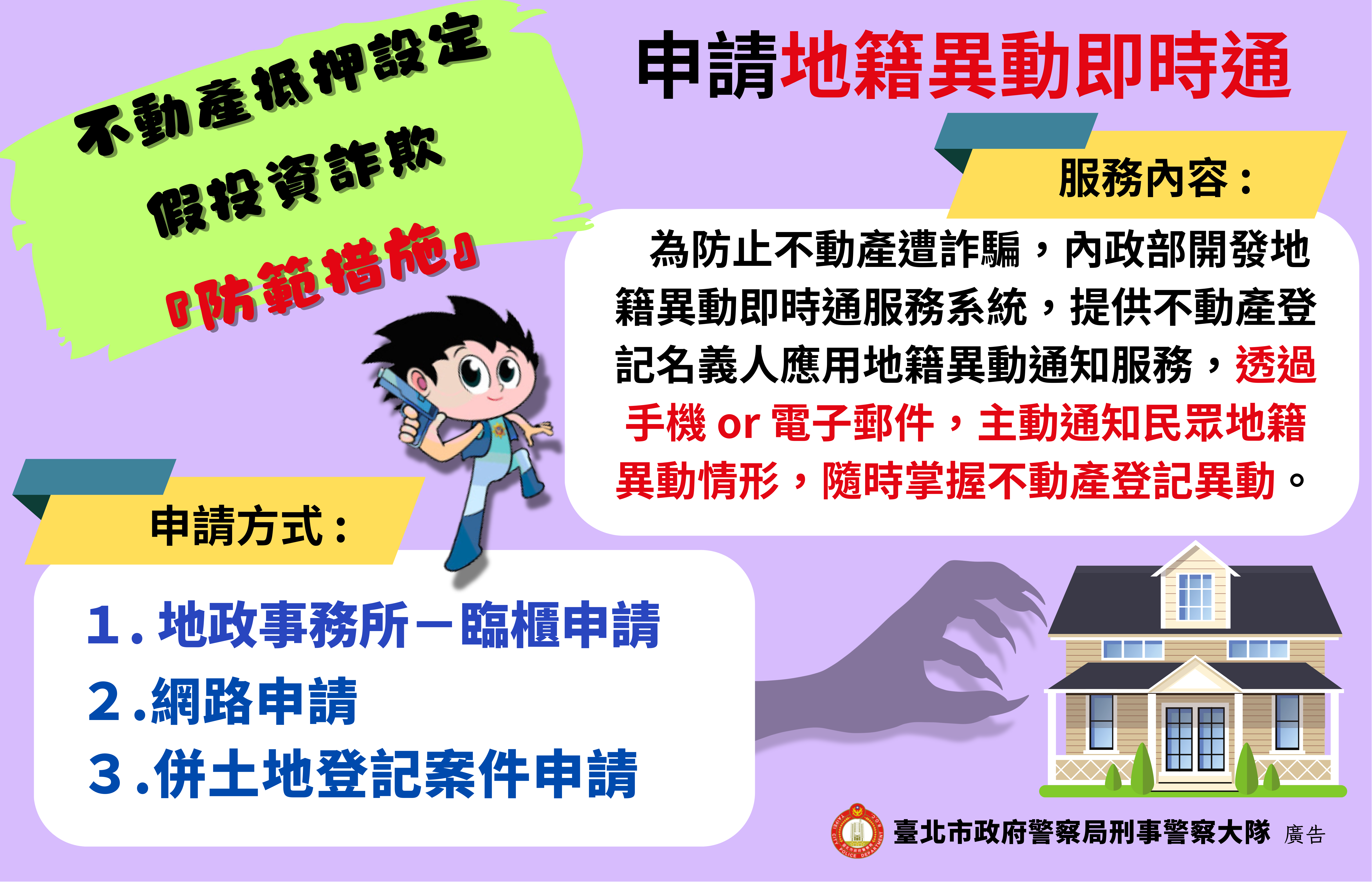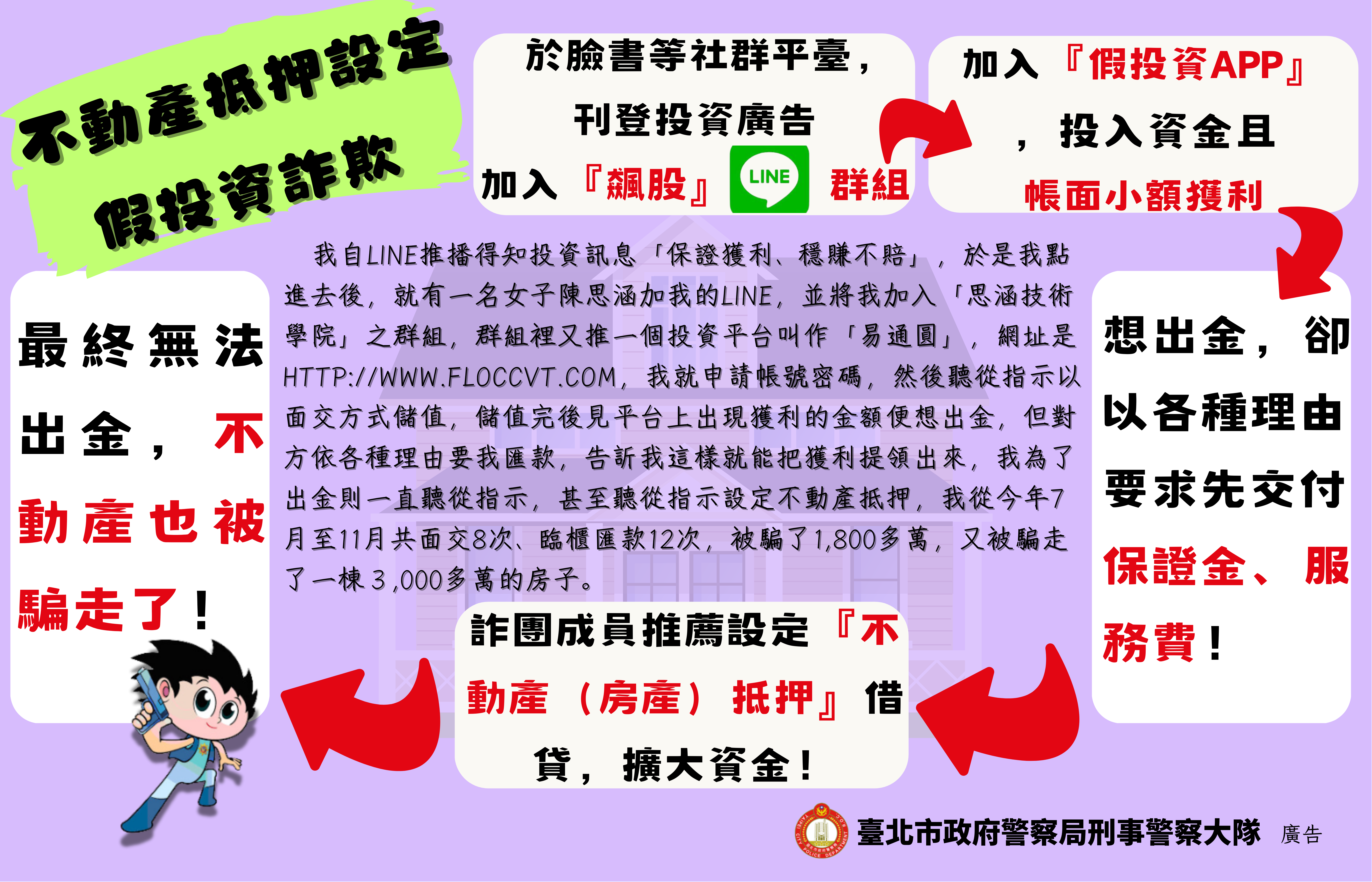 三、因應假投資詐欺、網路購物詐騙、假買家騙賣家為前3大高 發詐欺手法,另為預防「不動產抵押假投資詐騙案」發 生,本府警察局彙整宣導圖文素材5張