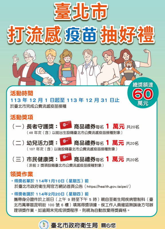 二、凡設籍臺北市之公費流感疫苗接種對象,113年12月1日至12 月31日期間於本市合約醫療院所或接種站接種流感疫苗 者,均符合活動抽獎資格。參加民眾毋需填寫抽獎券,後續將由本局自全國性預防接種資訊管理系統(NIIS)下載 醫療院所上傳之接種名冊後進行抽獎。