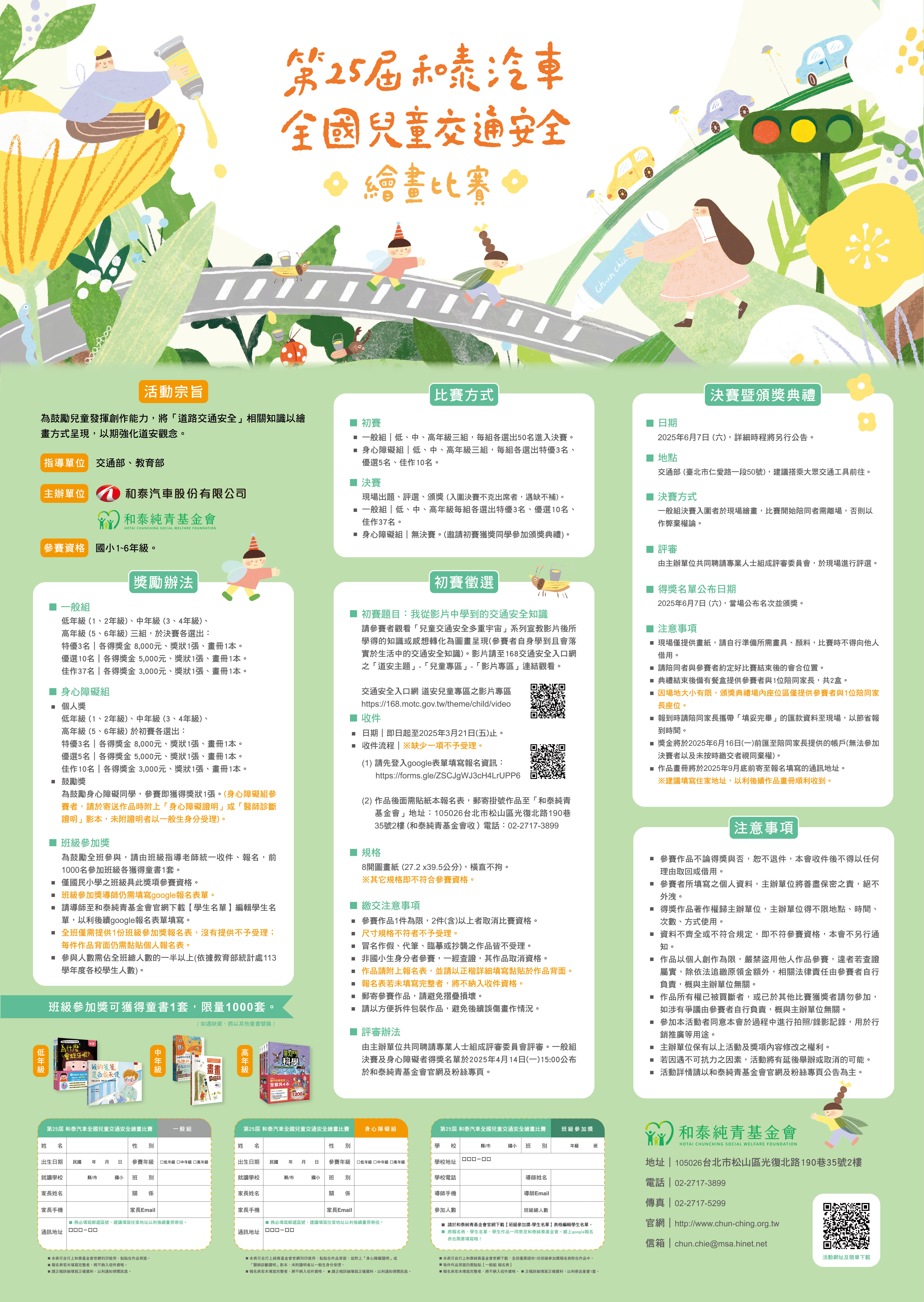 主旨:轉知教育部函轉財團法人和泰純青社會福利基金會辦理 「第25屆和泰汽車全國兒童交通安全繪畫比賽」活動訊息 。