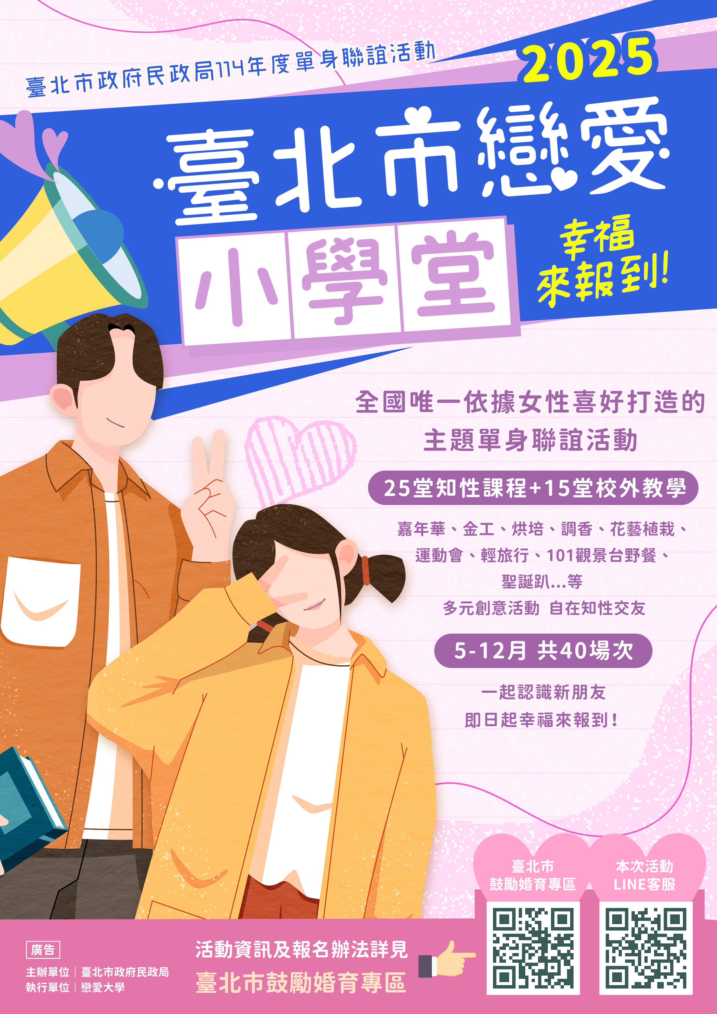 旨揭活動辦理期間為114年5月17日起至12月6日止,共計40場次;凡年滿 25 歲以上在臺設有戶籍之單身朋友即可報名參加。活動採線上表單方式報名,第1梯次(第1至6場)活動報名自114年4月21日上午9時起至4月30日17時止,其他5梯次將陸續開放,活動詳情及報名連結可至臺北市鼓勵婚育專區查詢(https://loveactually.gov.taipei/)。