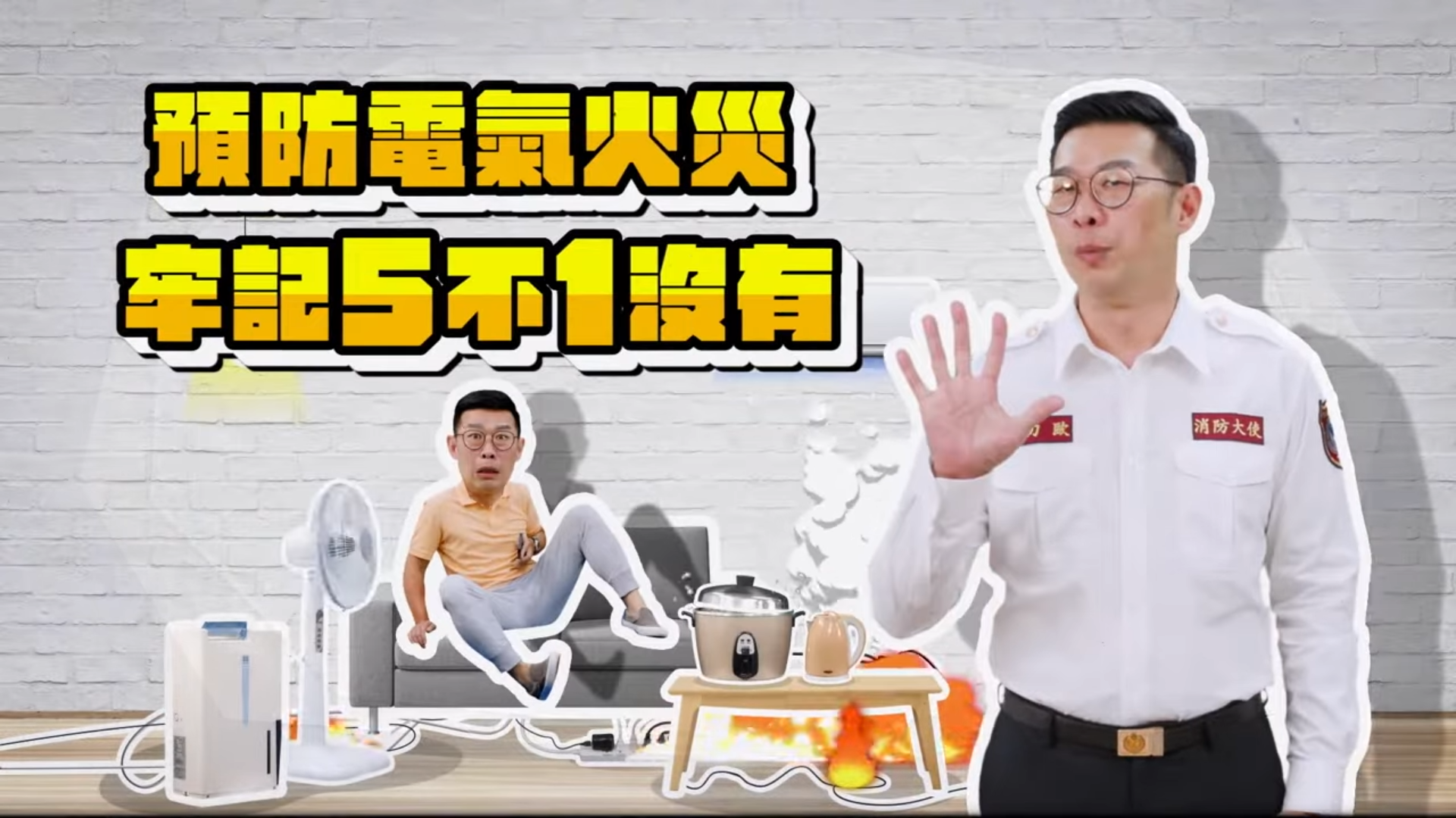 預防電氣火災,請牢記5不1沒有原則,電線不綑綁折損、用電不超過負載、電器周圍不放可燃物、插頭不潮濕汙損、電源插座不用不插、不買不用沒有安全標章的電器產品