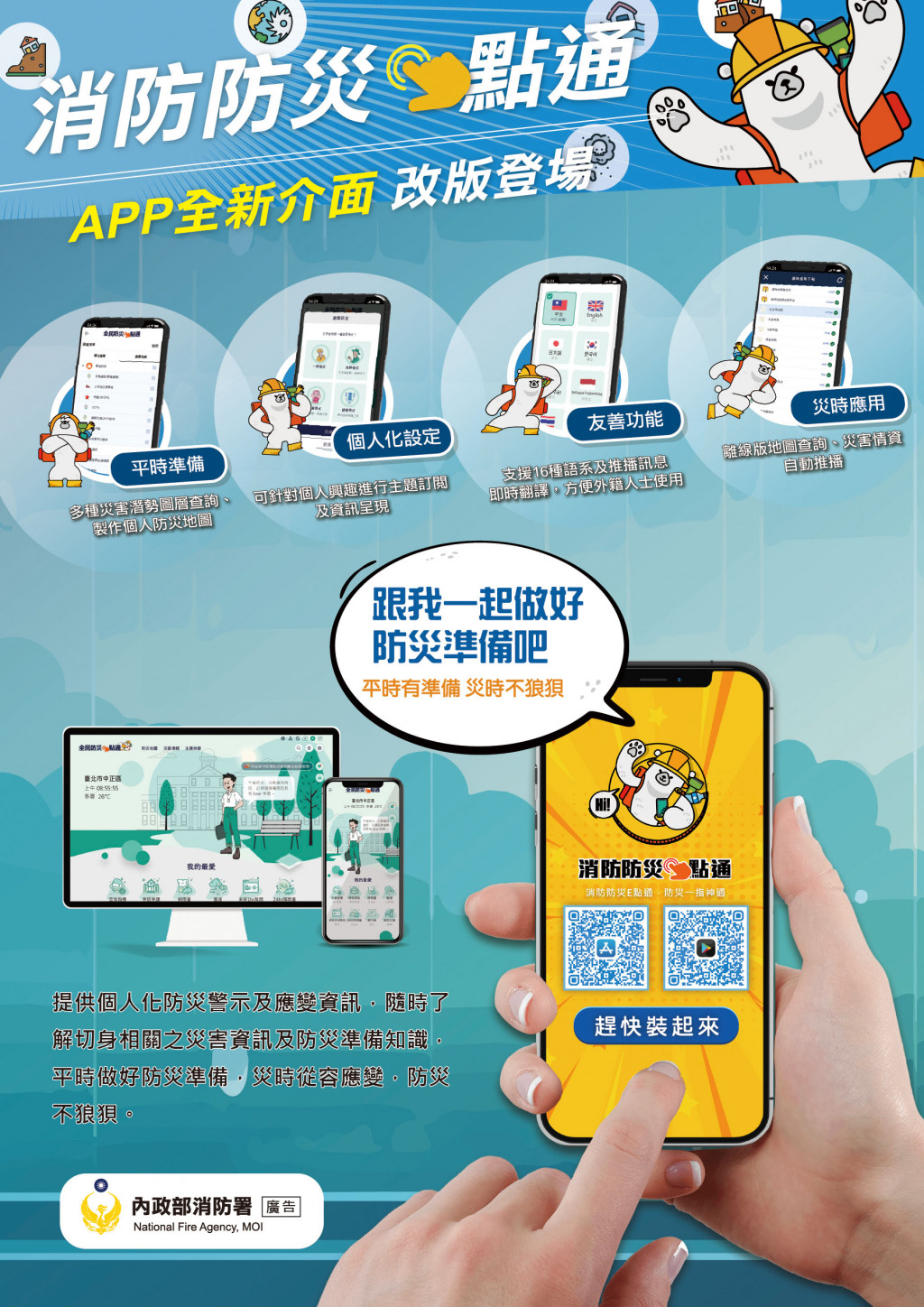二、推廣全民使用「全民防災e點通網站」及「消防防災e點通APP」,歡迎踴躍下載使用。