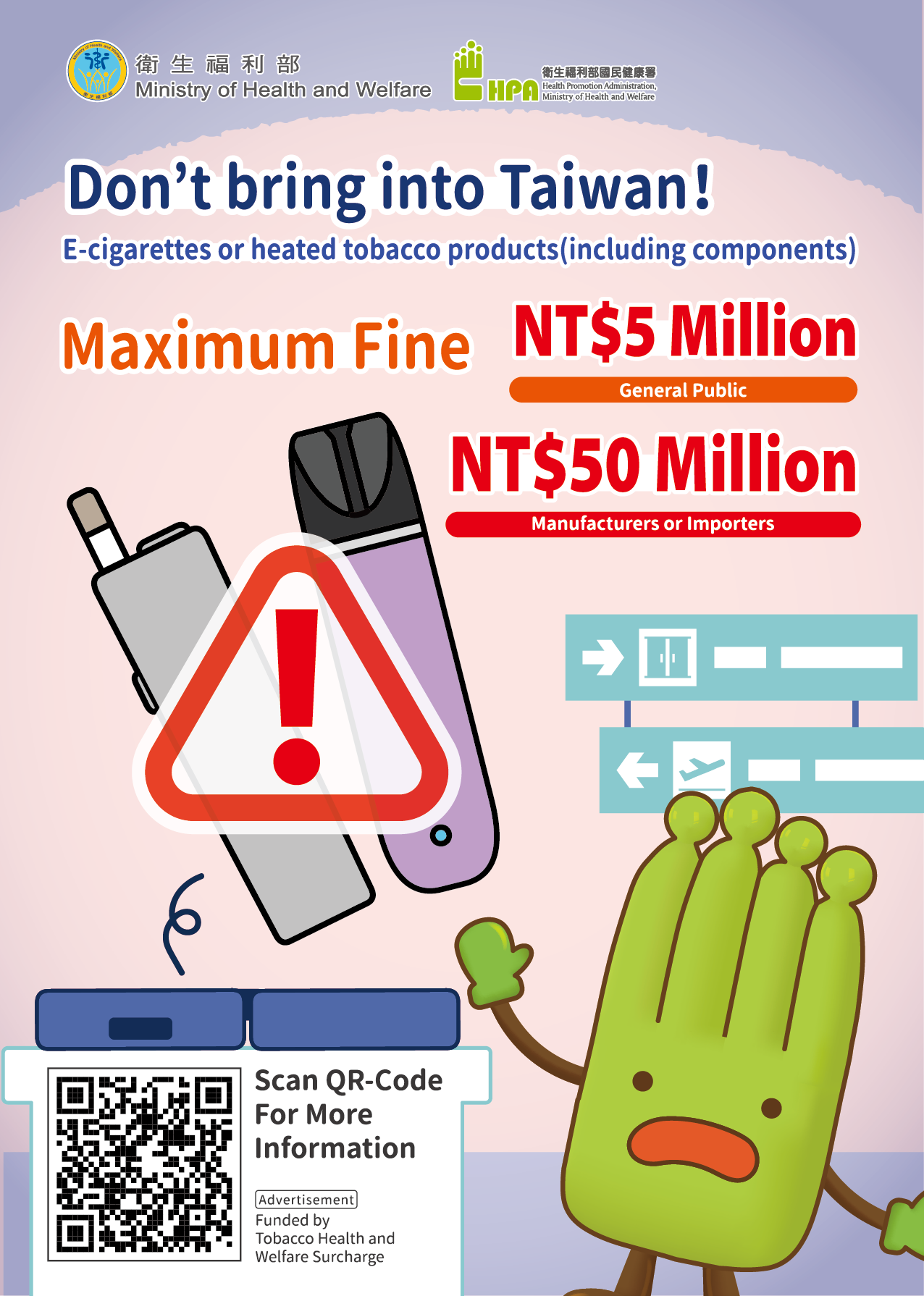 三、為強化向國人及非本國籍入境旅客宣導「禁止攜帶電子煙或加熱菸入境」,請協助運用旨揭宣導單張及電視牆、佈告欄等多元管道廣為宣導。若有任何疑問,請洽衛生福利 部承辦人許庭毓先生(電話02-25220888 轉609)。