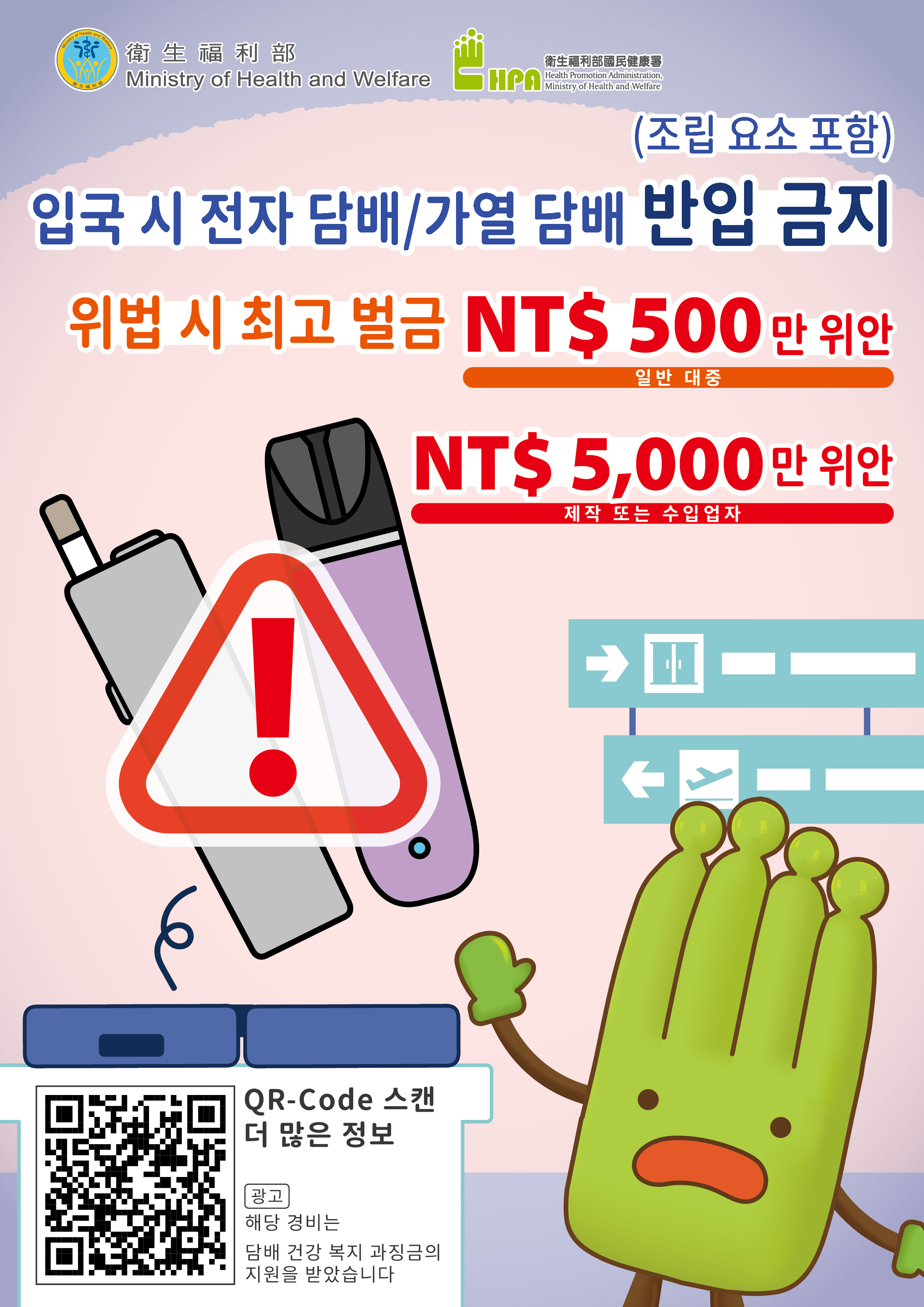 二、依菸害防制法第15條第1項第3款及同條第2項規定,任何人 不得輸入電子煙或未經核定通過健康風險評估審查之指定 菸品(加熱菸)及其必要之組合元件,目前尚無經衛生福利 部核定通過之指定菸品及其必要組合元件。違法輸入之業 者最高可處新臺幣5千萬元罰鍰;旅客攜帶電子煙或加熱菸 入境者,處新臺幣 5萬元至500萬元罰鍰。