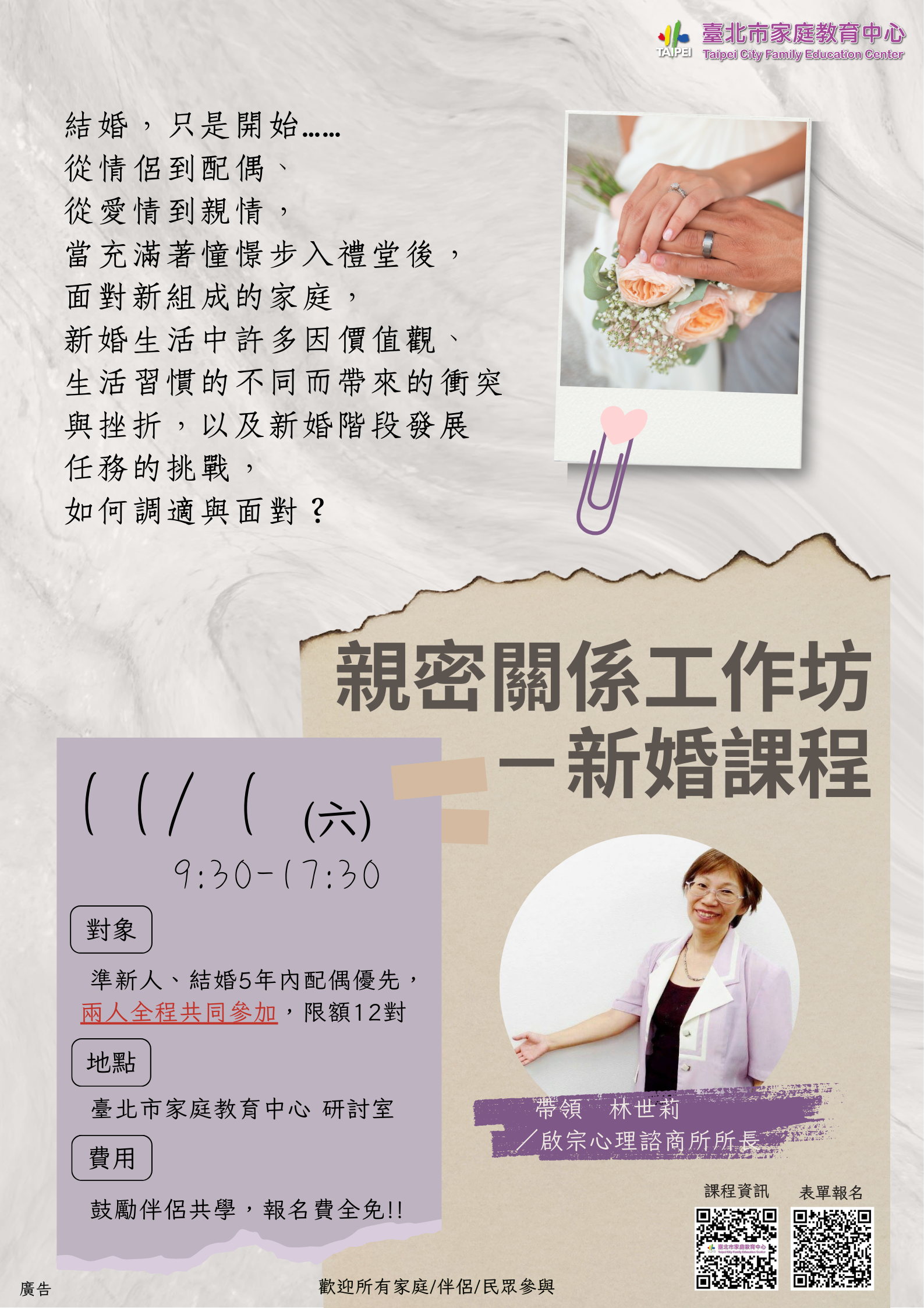(一)對象:準新人、新婚5年內伴侶,須兩人全程共同參加, 限額12對。
