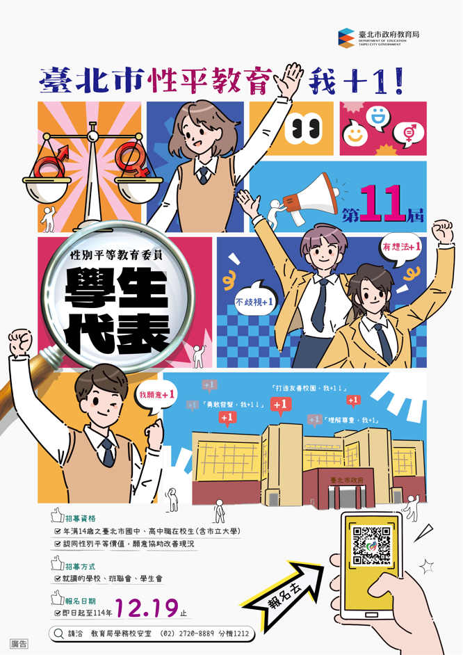 (四)遴選方式:先由校內聘請具性別平等教育相關領域之專家學者辦理審查會議或遴選,再於114年12月19日(星期五)下午5時前將經校內評選後適合之學生代表推薦表郵寄或親送至本局學務校安室(以郵戳為憑);推薦表電子檔併請傳送至ay0279@gov.taipei。如有疑義,可電洽(02)2720-8889轉分機1212徐先生。