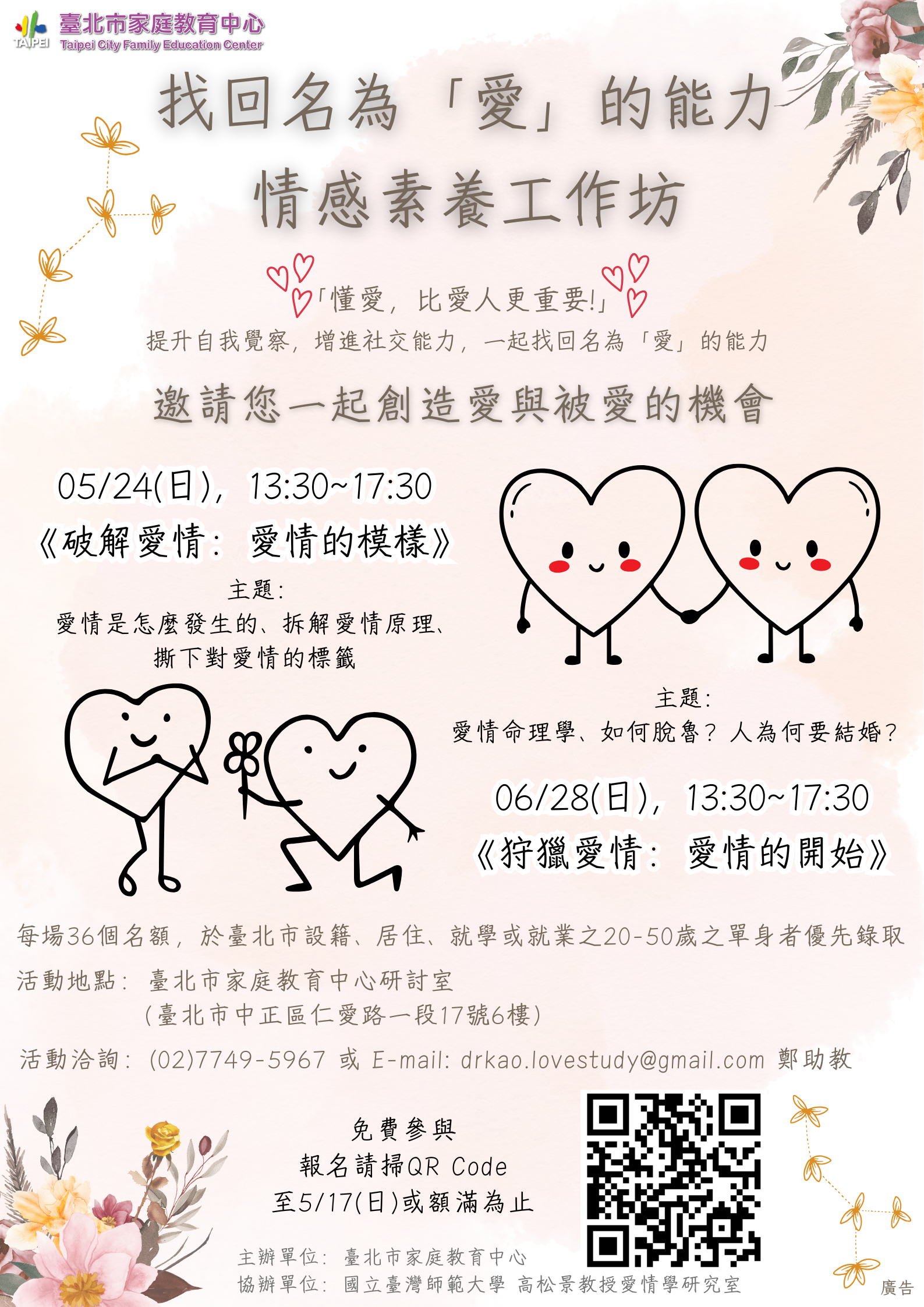 臺北市家庭教育中心115年度『找回名為「愛」的能力—情感素養工作坊』,於5月24日及6月