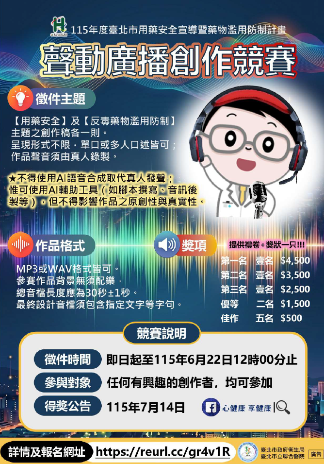 二、為推廣正確用藥安全知識及強化藥物濫用防制觀念,本競賽鼓勵參與者結合創意腳本與聲音表現,製作具教育性與感染力之廣播作品,並藉由多元媒體管道擴散宣導內容,深化民眾對用藥安全之正確認知,並提升對藥物濫用風險之警覺性,進而達到預防與宣導之整體效益(活動辦法及活動電子海報如附件)。